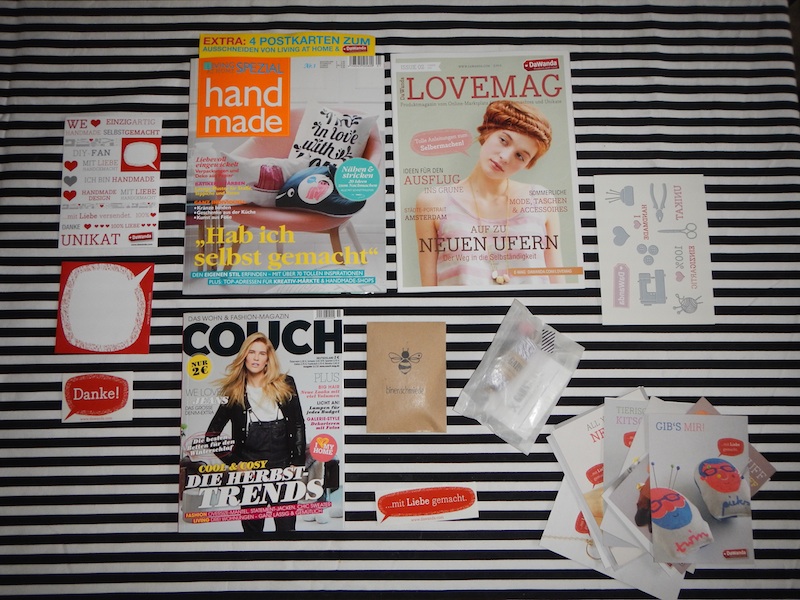 Und so sieht es nun aus, dass kleine Goodie Bag für morgen. Also der Inhalt. Denn das Ganze kommt morgen in einem liebevollen DaWanda-Beutel daher. Neben DaWanda haben sich Binenschmiede, Couch, Living at home und Garn & Mehr beteiligt. Ein herzliches Dankeschön dafür!
