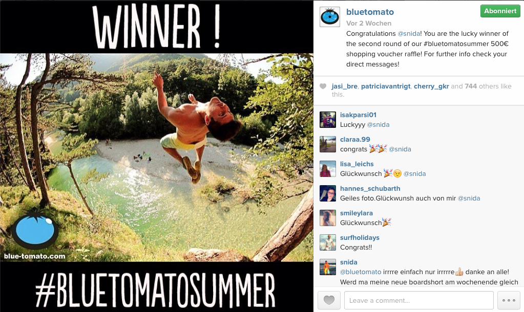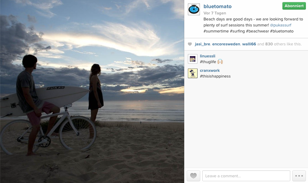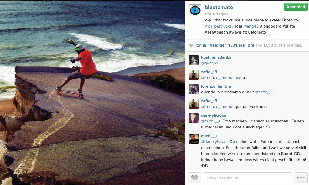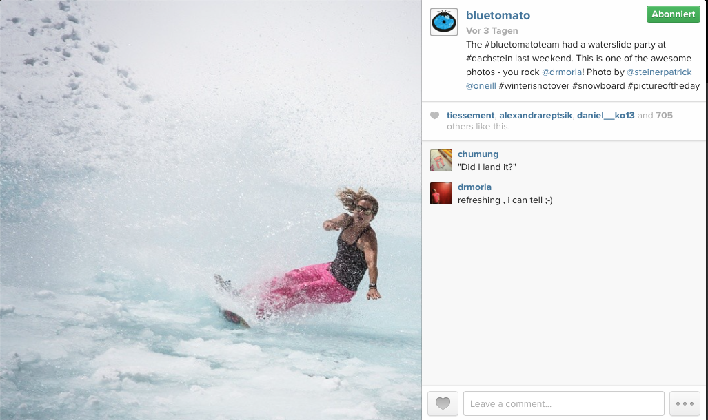 Blue Tomato zeigt bei Instagram nahezu ausschließlich professionell aufgenommene Fotos, die das Lebensgefühl und die Träume der potentiellen Kunden zeigen. Stets werden die bewegungsreichen hippen Sportarten gezeigt, für die Blue Tomate das passende Equipment in seinen Shops verkauft: Skateboarding, Surfen, Snowboarding. Wer in diesen Sportarten unterwegs ist, kann beim Betrachten der Bilder gar nichts anders als “Hach, das könnte ich auch gern” bzw. “Ach, da wäre ich auch gern” zu seufzen.